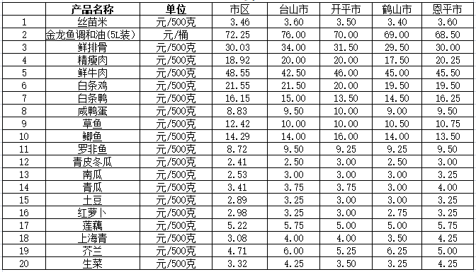 说明:1、表中价格为该地区监测点综合平均价;2、“市区”含蓬江区、江海区、新会区,价格分别采自蓬江市场、江南市场、城东市场等13家农贸市场;3、其他四个县市价格分别采自新华市场、锦江市场等8家农贸市场。