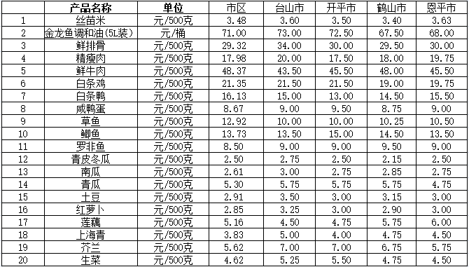 说明:1、表中价格为该地区监测点综合平均价;2、“市区”含蓬江区、江海区、新会区,价格分别采自蓬江市场、江南市场、城东市场等13家农贸市场;3、其他四个县市价格分别采自新华市场、锦江市场等8家农贸市场。