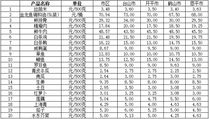 说明:1、表中价格为该地区监测点上周综合平均价;2、“市区”含蓬江区、江海区、新会区,价格分别采自蓬江市场、江南市场、城东市场等13家农贸市场;3、其他四个县市价格分别采自新华市场、锦江市场等8家农贸市场。