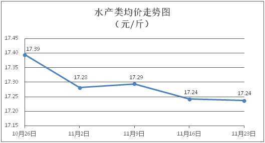 水产类商品价格微幅波动。所监测的水产商品价格波动情况为2涨2跌5平,综合均价为每斤17.24元,环比下降0.03%。其中:草鱼、鲫鱼、鳙鱼、基围虾零售均价分别为每斤11.39元、13.75元、10.73元、28.33元,环比分别持平、下降0.58%、上涨0.47%、下降0.18%。