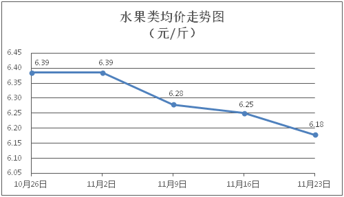 水果类商品价格小幅下降。所监测的水果商品价格波动情况为4跌2平,综合零售均价为每斤6.18元,环比下降1.15%。其中橙子、香蕉、梨零售均价分别为每斤6.49元、2.73元、5.20元,环比分别下降3.57%、持平、下降1.52%。