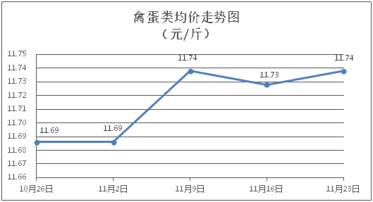 禽蛋类商品价格稳中有涨。所监测的禽蛋类商品价格波动情况为1涨4平,综合零售均价为每斤11.74元,环比上涨0.24%。其中:白条鸡、白条鸭零售均价分别为每斤20.95元、15.27元,环比分别上涨0.24%、持平;鸡蛋、咸鸭蛋零售均价分别为每斤6.35元、8.93元,环比均持平。