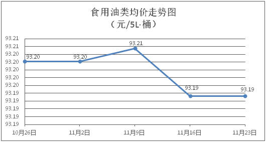 食用油类商品价格微幅盘整。所监测的食用油(5L装)商品价格波动情况为3涨2跌4平,综合零售均价为每桶93.19元,环比持平。其中:金龙鱼花生油、金龙鱼调和油零售均价分别为每桶100.69元、70.19元,环比分别上涨0.02%、下降0.03%。