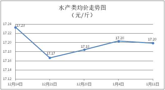 水产类商品价格窄幅盘整。所监测的水产商品价格波动情况为2涨2跌5平,综合均价为每斤17.20元,环比下降0.03%。其中:草鱼、鲫鱼、罗非鱼、基围虾零售均价分别为每斤11.46元、13.86元、8.81元、28.04元,环比分别持平、下降0.50%、上涨0.46%、下降0.14%。
