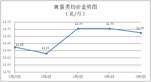 禽蛋类商品价格微幅波动。所监测的禽蛋类商品价格波动情况为1涨3跌1平,综合零售均价为每斤11.69元,环比下降0.10%。其中:白条鸡、白条鸭零售均价分别为每斤21.24元、15.22元,环比分别下降0.05%、下降0.39%;鸡蛋、咸鸭蛋零售均价分别为每斤6.25元、8.75元,环比分别下降0.48%、持平。