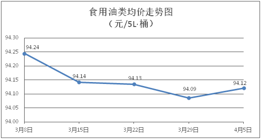 食用油类商品价格总体略涨。所监测的食用油(5L装)商品价格波动情况为4涨2跌3平,综合零售均价为每桶94.12元,环比上涨0.04%。其中:鲁花花生油、金龙鱼调和油零售均价分别为每桶156.01元、70.13元,环比分别上涨0.13%、下降0.09%。