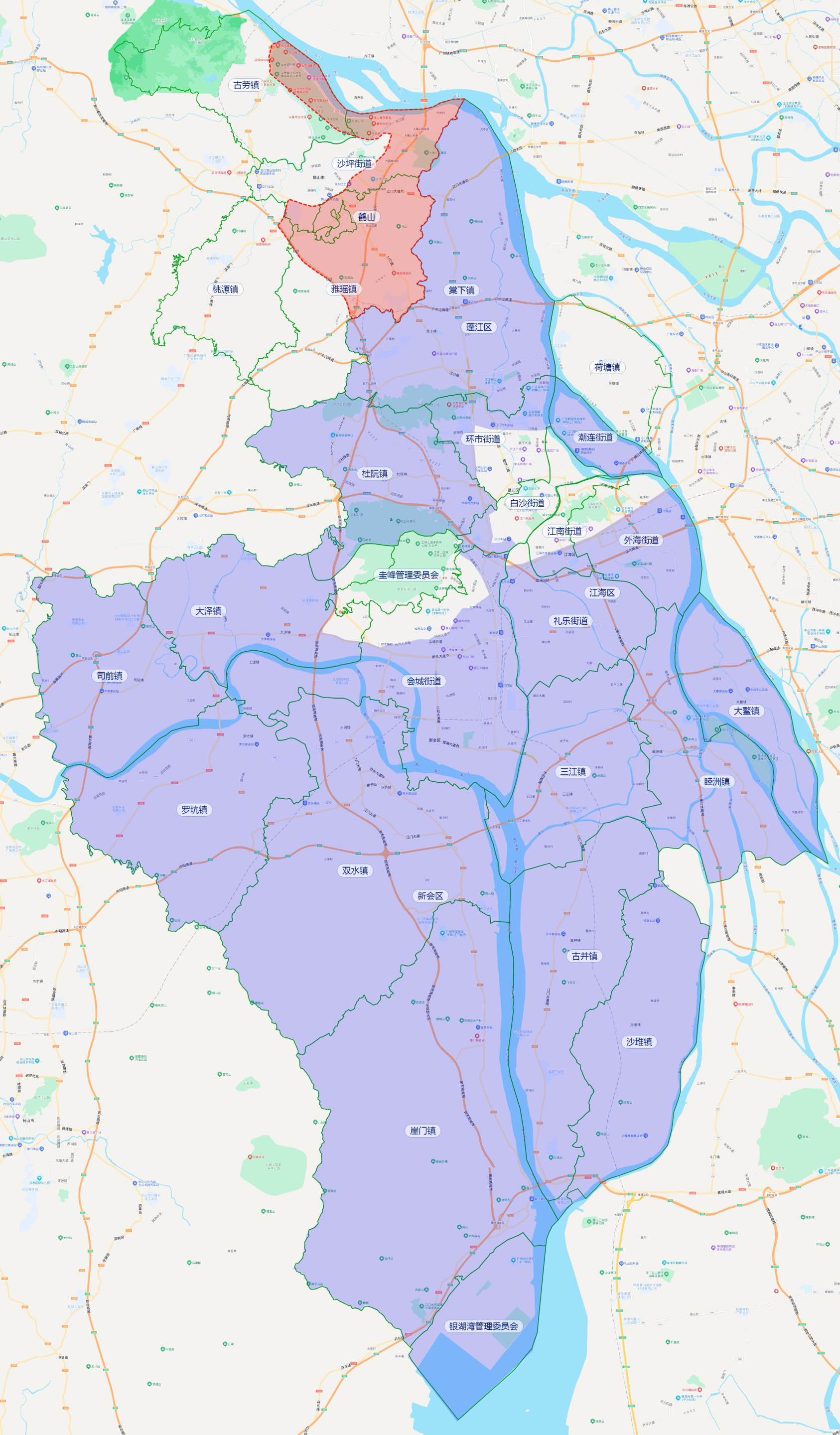 第一批开放区域:蓬江区为江侨路以北、江门大道以西区域(不包括荷塘镇);江海区为五邑路以南区域;新会区为冈州大道以南区域(不包括新会大道及大泽镇G240道路)。详见附件示意图紫色区域。