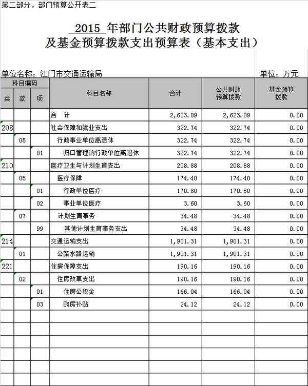 2015 年部门支出预算17795.35万元,其中本年支出17540.6万元,占98.57%,包括:社会保障和就业(类)支出380.85万元,占2.17%;医疗卫生与计划生育(类)支出308.06万元,占1.76%;城乡社区(类)支出300.00万元,占1.71%;交通运输(类)支出16223.53万元,占92.49%;住房保障(类)支出278.16万元,占1.59%;其他支出50万元,占0.28%。对附属单位补助支出115万元,占0.65%;结转下年支出139.75万元,占0.78%。