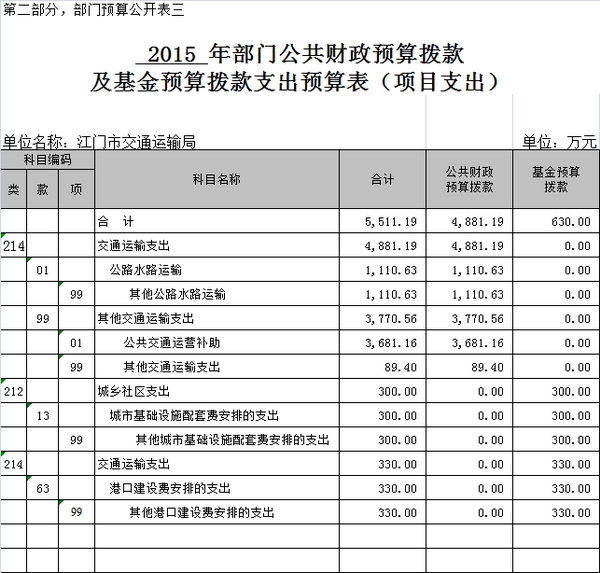 项目支出预算5511.19万元,主要支出项目有公路水路运输支出1110.63万元、公共交通运营补助支出3681.16万元、其他交通运输支出89.40万元、港口建设费330.00万元、城市基础设施配套费300.00万元。与上年比增加主要是增加公交优先发展专项资金3048.00万元,新能源汽车应用推广专项资金1183.16万元,江门市市区城市公共交通专项规划修编300万元等项目支出。