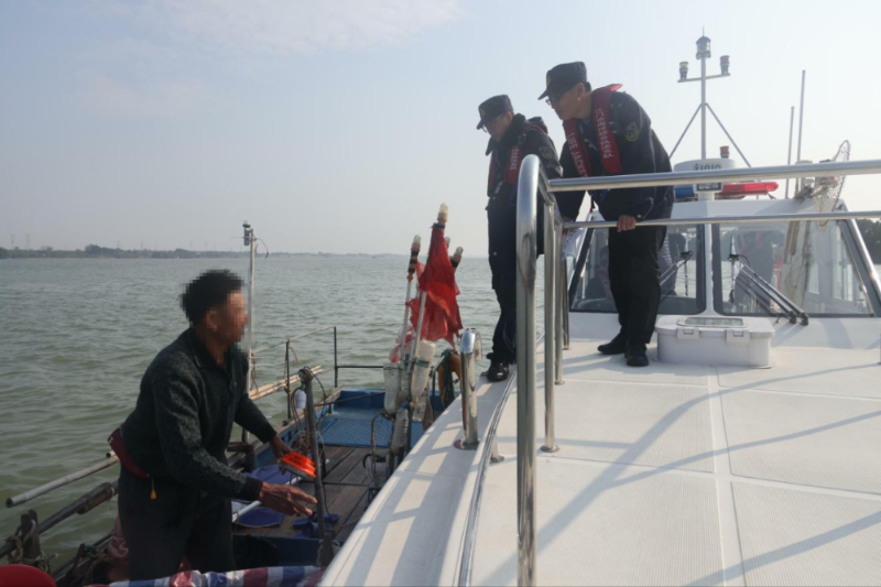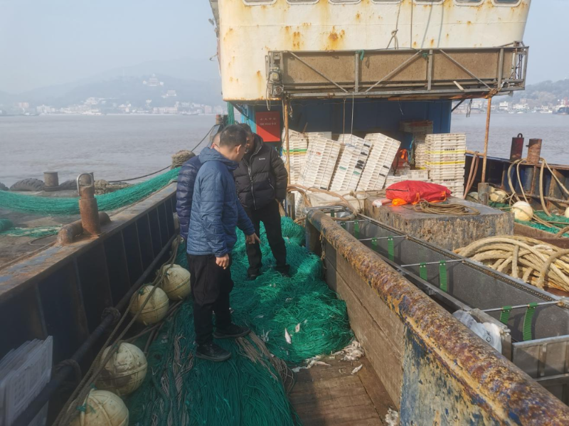 2026年1月5日,市海洋综合执法支队渔业执法科在江顺大桥至新会睦洲水域开展执法巡航行动,共出动执法船艇2艘,执法人员11人次,检查渔船8艘,派发宣传资料8份,对临水作业不穿戴救生衣行为现场责令整改,查扣涉渔“三无”船舶1艘。