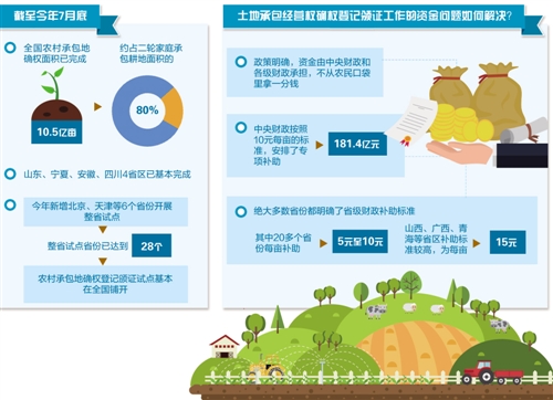 数据显示,截至今年7月底,全国农村承包地确权面积已完成10.5亿亩,约占二轮家庭承包耕地面积的80%。目前,山东、宁夏、安徽、四川4省区确权工作已基本完成。今年新增北京、天津等6个省份开展整省试点,整省试点省份已达到28个,农村承包地确权登记颁证试点基本在全国铺开。
