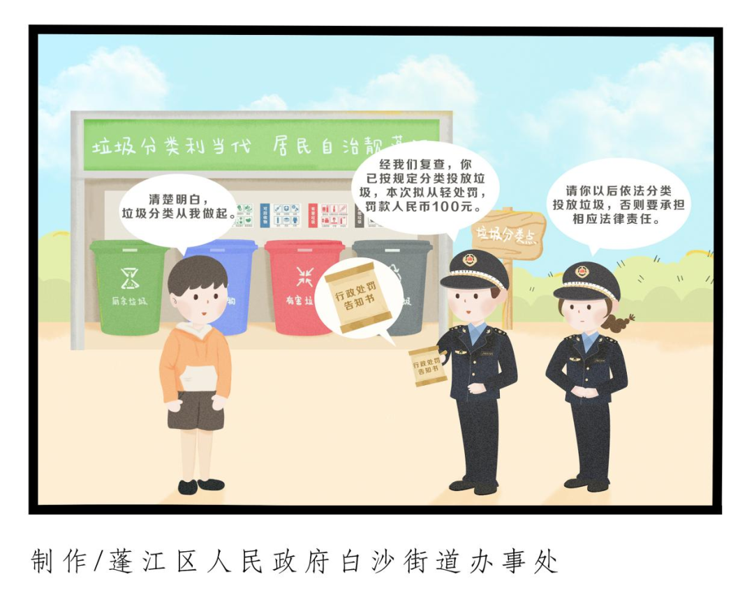 本期案例改编于白沙街道真实案例,白沙街道办事处执法人员在日常巡查过程中,发现辖区某居民未按垃圾分类的规定,随意倾倒、堆放了生活垃圾,违反了《广东省城乡生活垃圾管理条例》第二十条第一款的规定,执法人员向该居民发出责令改正通知书,要求现场立即改正。经核查,该居民已按规定分类投放垃圾,按《广东省城乡生活垃圾管理条例》第五十三条规定,依法对其从轻处罚。