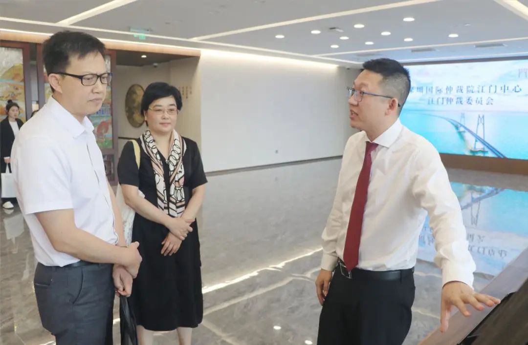 在深圳国际仲裁院江门中心,调研组参观了深国仲江门中心的办公环境,认真听取了深国仲江门中心副秘书长李一鸣对深国仲江门中心的情况介绍。调研组对江门市打造市场化、法治化、国际化一流营商环境,打造珠江口西岸商事争议解决服务优选地,对深国仲江门中心的建设成效给予高度评价和充分肯定。