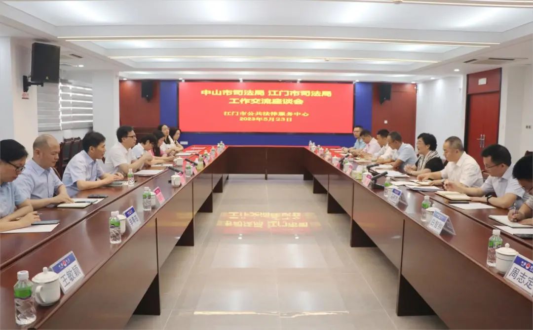 5月23日,中山市司法局党组书记、局长王跃飞带领调研组一行到江门市调研司法行政工作。江门市司法局党组书记、局长芶晓彤,局领导陈勇、胡振宇和相关科室负责人陪同调研并参加座谈。