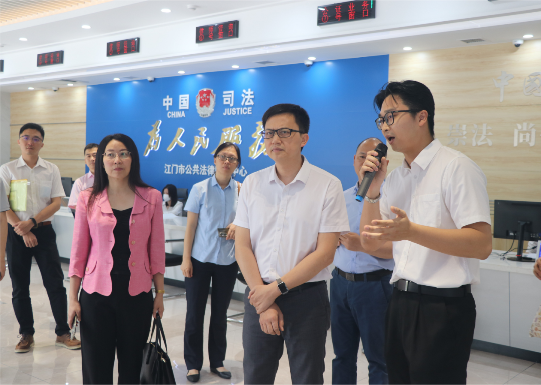 调研组来到江门市公共法律服务中心参观调研,深入了解江门市司法局积极打造华侨华人公共法律服务国家平台,提升侨都维护华侨华人合法权益功能,加快建成市离岸公共法律服务中心,上线“江门智慧司法”“江门涉外法律服务地图”两个小程序,打造“法治政府面对面”“法治直播间”“律动侨都 法润江门”周六一小时公益法律咨询活动三大法治品牌等工作情况。