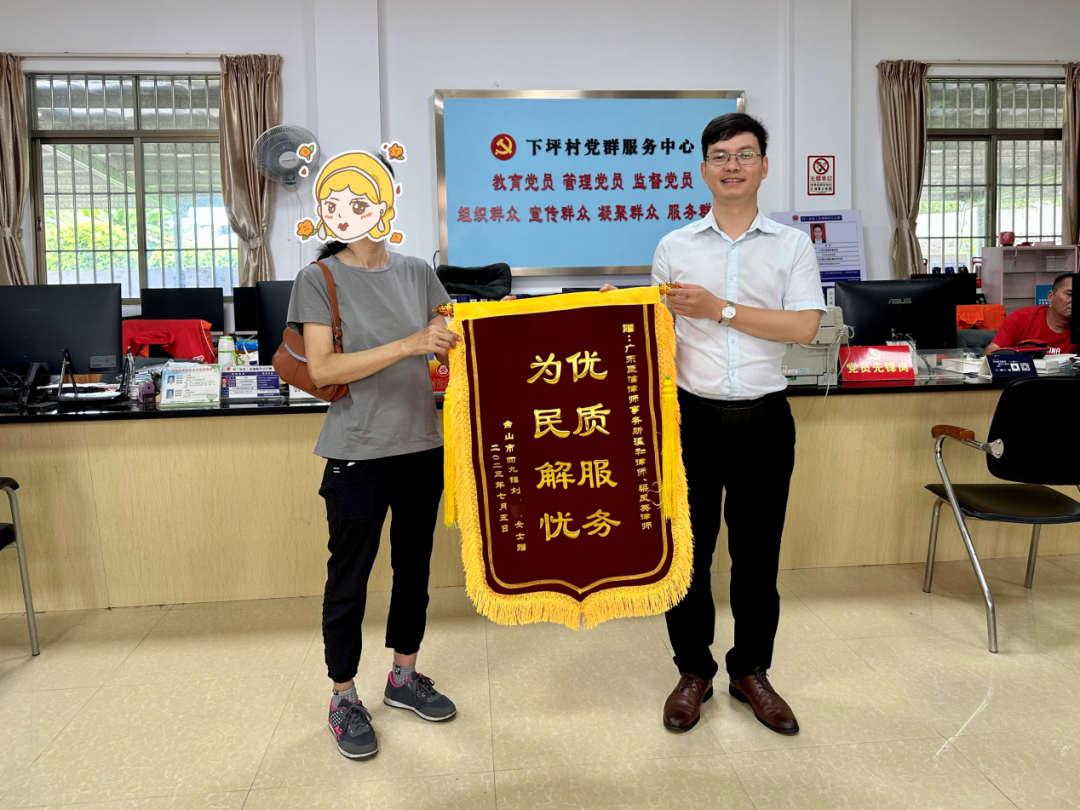 近日,台山市四九镇刘女士将一面“为民解忧,优质服务”的锦旗赠与正在下坪村委会值班的驻村法律顾问广东巨信律师事务所温和律师,对温律师的专业帮助与辛勤付出表示衷心的感谢。