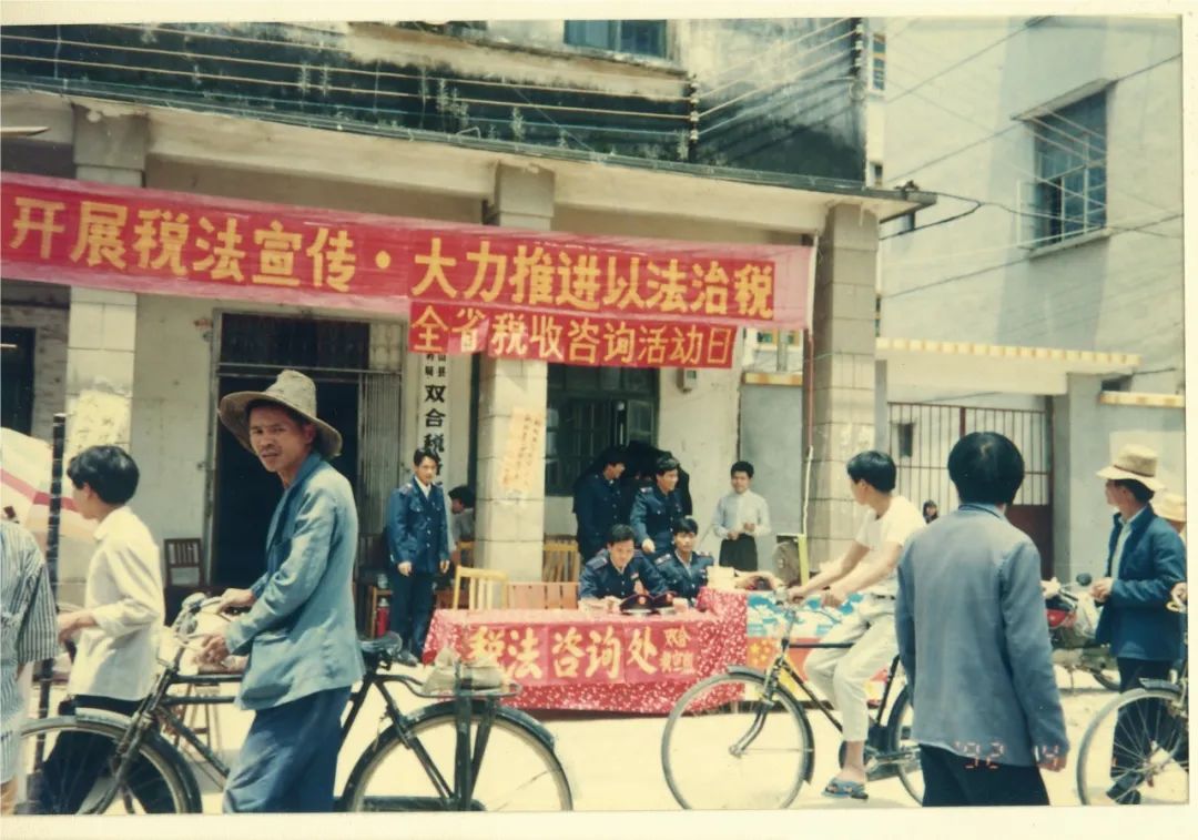图为1992年全省税收宣传咨询日活动。江门市税务局提供