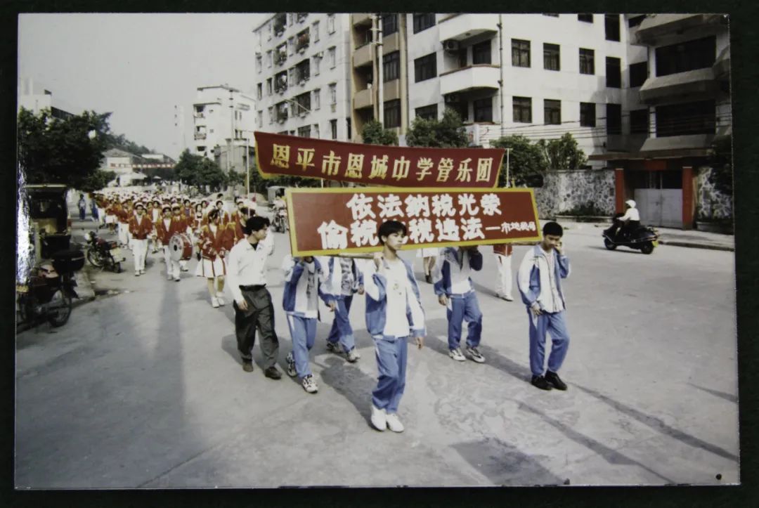图为1997年4月,恩平恩城中学师生协助税收宣传。江门市税务局提供