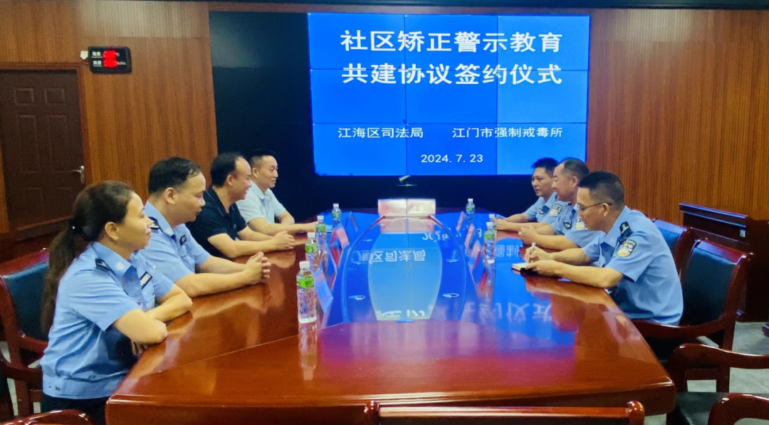 为落实建设教育基地的工作要求,江海区司法局与市强制隔离戒毒所代表进行了座谈,就教育合作模式、内容、机制进行了广泛交流、全面探讨后,签订了共建协议。双方表示,将加强沟通协调,大力发挥警示教育基地作用,充分依托戒毒场所的资源配置和管理教育经验,不断创新警示教育模式,丰富警示教育形式和内容,优势互补、共赢发展,为社区矫正对象顺利回归和融入社会打好基础。