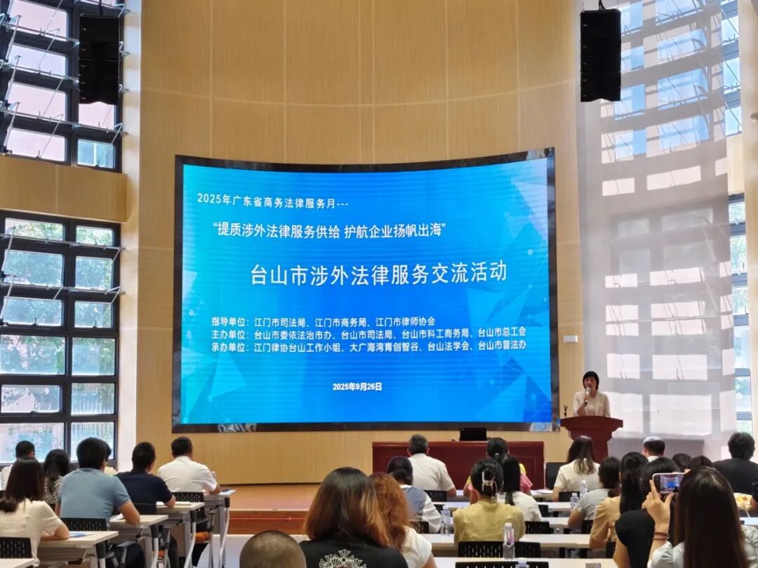 为深入贯彻全省涉外法治工作会议精神,持续健全涉外法治保障体系,进一步提升我市外贸企业的境外合规经营和风险防控能力。2025年9月26日,全省商务法律服务月暨“法护营商 律企同行”涉外法律服务台山专场活动在台山市青创智谷顺利举行。