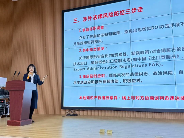 活动邀请全国律协涉外律师领军人才曾莉律师以“国际贸易法律风险防控”为题,直面企业出海首要挑战,深入剖析了国际贸易合同中的关键风险点,从贸易术语选择的权责边界,到信用证支付的隐性陷阱,再到违约索赔的实操机制,层层剖析、逐个支招,助力企业从源头构建法律“防火墙”,夯实出海“压舱石”。