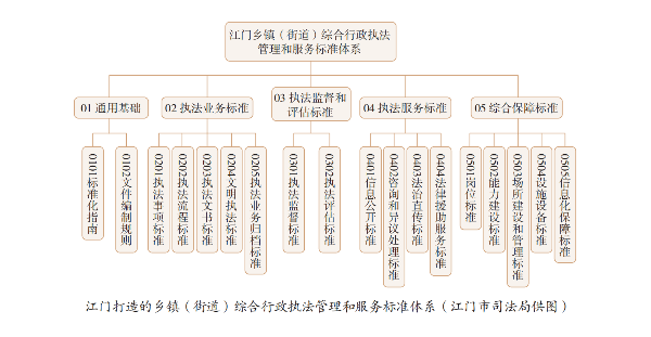 该案例展现江门深入学习贯彻习近平法治思想,以执法规范化标准化建设为着力点,全面推进镇街综合行政执法改革工作,理顺基层权责关系,有效破解“看得见管不着”等治理难题,进一步激发镇街经济社会发展活力,优化法治化营商环境的具体做法。相关工作被国家标准化管理委员会、司法部列为全国标准试点,中央电视台、新华社、中国新闻周刊等国家级媒体先后采访报道。