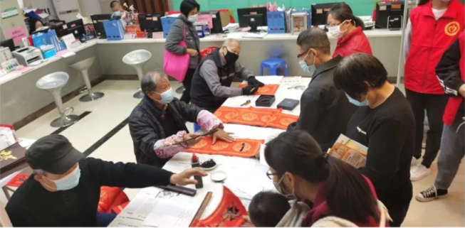 此次活动邀请了三名老党员书法家前来现场为市民群众写春联。为做好新冠肺炎疫情防控工作,避免集聚情况出现,活动现场采取登记派号的方式轮流安排市民群众领取春联。市商务局的党员义工还组成了“家庭志愿者小分队”,主动为因行动不便而无法到现场参加活动的社区低保户和困难党员送春联到家。