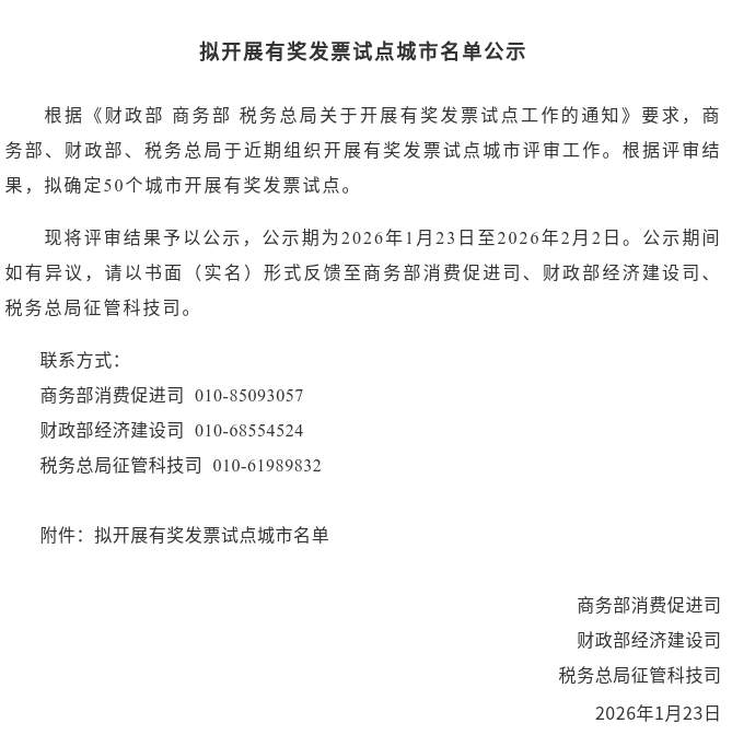 近日,商务部、财政部、税务总局联合发布《拟开展有奖发票试点城市名单公示》,拟确定50个城市开展有奖发票试点,
