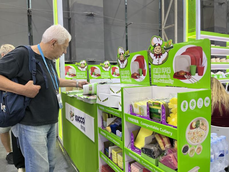 “这款餐盘是企业专为南美地区肯德基店量身研发的新品,凭借防油防水、可降解的优势,不仅完美适配当地特色餐食特性,还通过设计优化了堆叠结构,降低约30%的运输成本,目前年供货量达25个柜子,年销售额约300万美元,市场覆盖厄瓜多尔、哥伦比亚、智利等多个南美国家。”江门市意奇高工贸有限公司销售经理梁锦全介绍,企业产品可完全降解,并从餐饮拓展至航空、医疗多个场景,吸引大批注重环保的采购商前来洽谈。