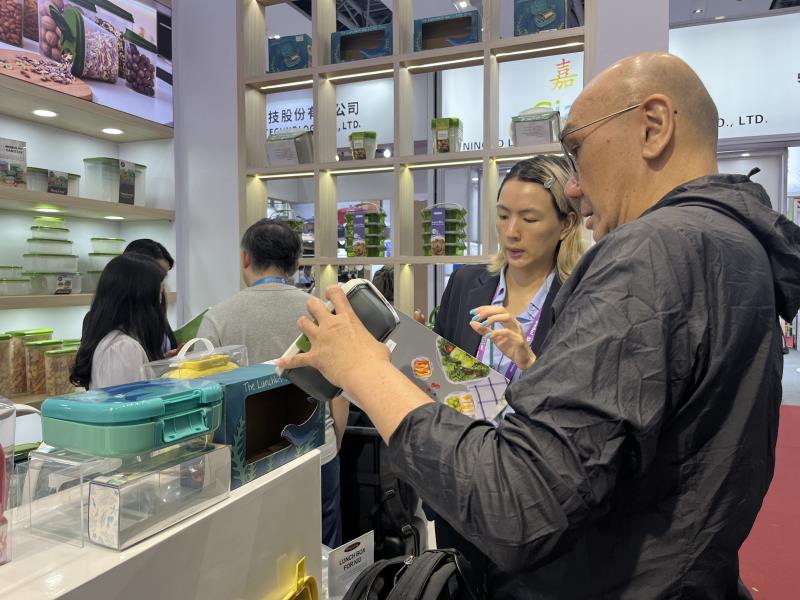 绿色环保同样成为本届展会江门企业的鲜明标签。江门市意奇高工贸有限公司展位前,国外采购商认真端详着展出的各类环保餐具,其中一款红色餐盘受到关注。
