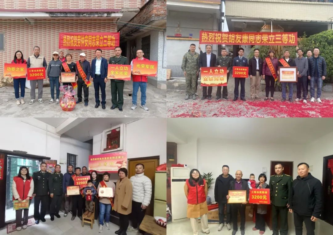 2024年度,开平籍现役军人劳仲安、吴兆伦、胡友康、周展业、罗伟成、司徒和顺,因在部队表现突出,荣立个人三等功。近日,开平市退役军人事务局、开平市人民武装部和属地武装部及退役军人服务站一行组成报喜团,分别为6名在部队立功的现役军人家庭送去喜报和慰问金,以表彰他们在国防和军队建设中的突出贡献,同时向军人家庭表达诚挚的感谢和崇高的敬意。