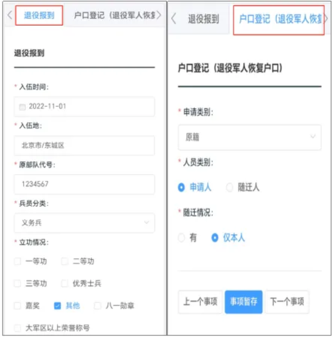 说明:符合条件的退役军人选择需要填报的事项,系统会默认选择退役报到、适应性培训、自主就业一次性经济补助金的给付、预备役登记等事项,可点击取消选择。退役报到和适应性培训是必填事项,不能取消。