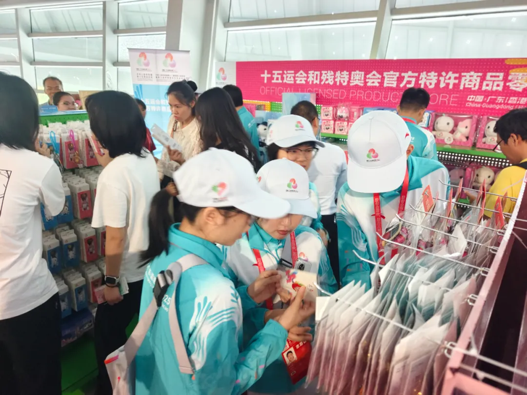 赛场外,十五运会和残特奥会官方特许商品店被挤得水泄不通,吉祥物喜洋洋、乐融融是当之无愧的顶流,受到众多观众追捧。