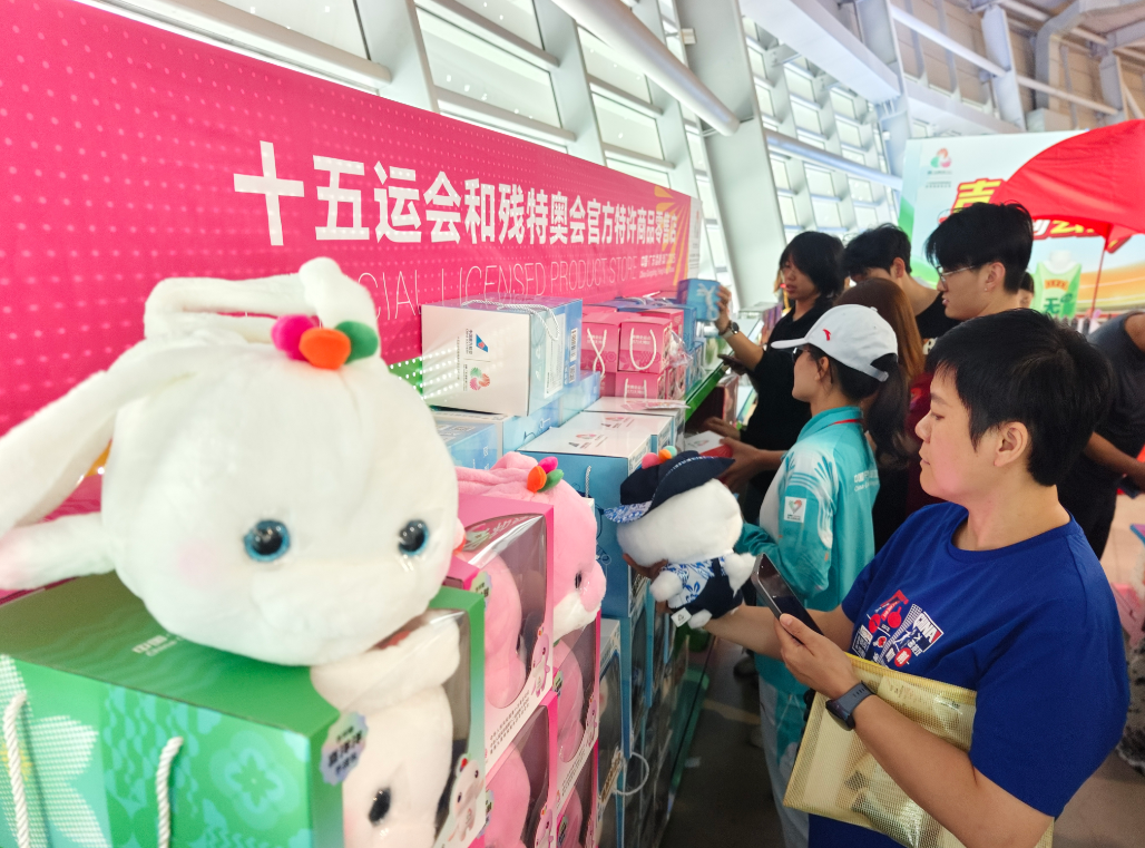 赛场外,十五运会和残特奥会官方特许商品店被挤得水泄不通,吉祥物喜洋洋、乐融融是当之无愧的顶流,受到众多观众追捧 郭永乐摄