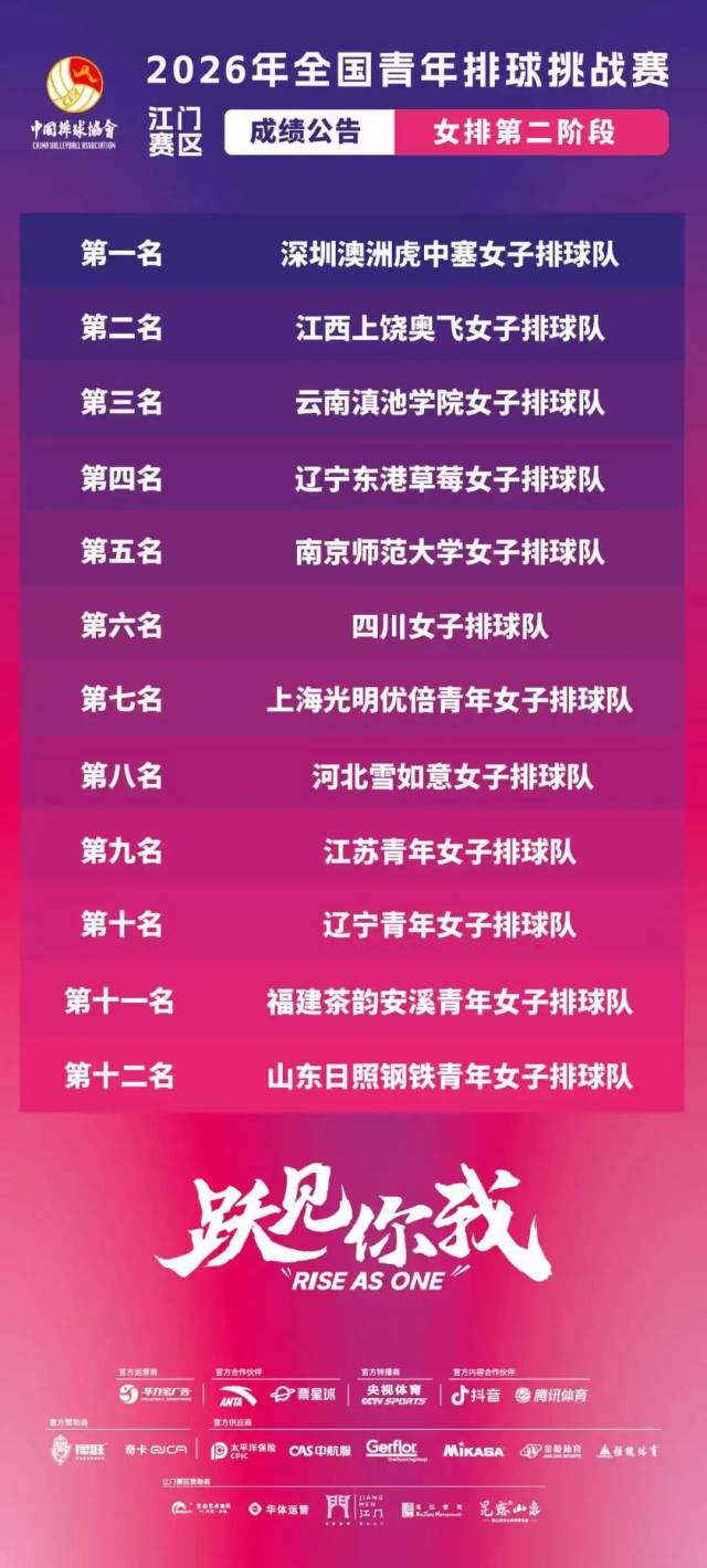 2026年全国青年排球挑战赛(第二阶段)江门赛区于2026年3月13日在江门体育中心体育馆圆满收官。本次赛事由国家体育总局排球运动管理中心主办,江门市文化广电旅游体育局、江门滨江华体体育会展中心有限公司承办,江门市蓬江区文化广电旅游体育局协办。
