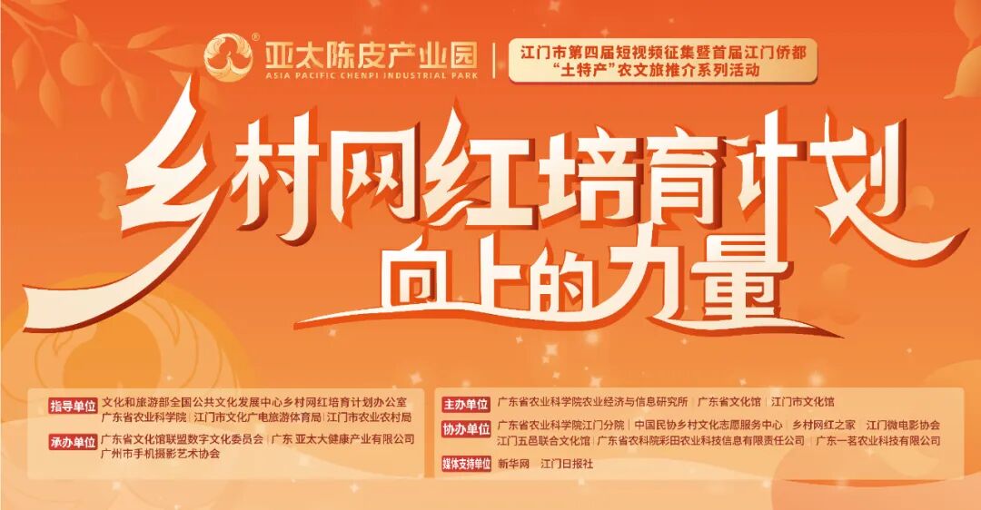 10月23日下午,由文化和旅游部全国公共文化发展中心乡村网红培育计划办公室、广东省农业科学院、江门市文化广电旅游体育局、江门市农业农村局指导,广东省农业科学院农业经济与信息研究所、广东省文化馆、江门市文化馆主办,广东省文化馆联盟数字文化委员会、广东亚太大健康产业有限公司、广州市手机摄影艺术协会承办的“乡村网红培育计划·向上的力量——江门市第四届短视频征集暨首届江门侨都‘土特产’农文旅推介系列活动”在江门市文化馆顺利举办,各相关单位领导嘉宾出席了活动。