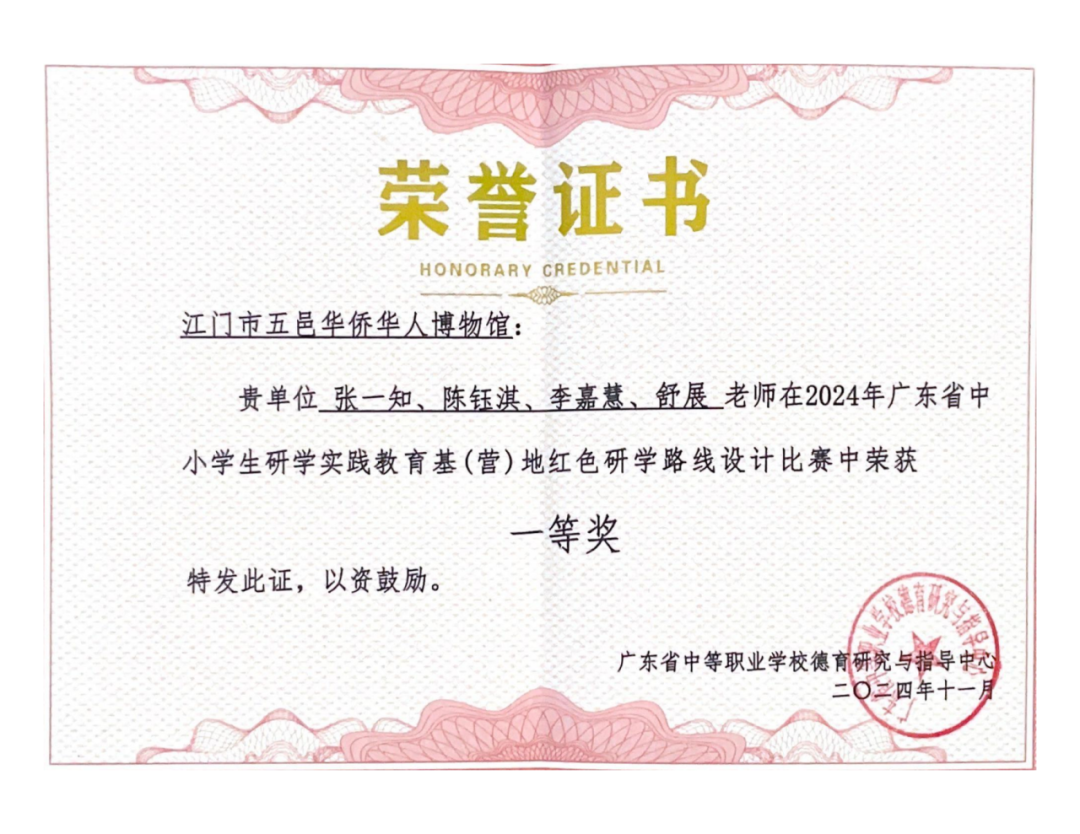 在11月21日举办的2024年广东省中小学生研学实践教育基(营)地红色研学路线设计比赛中,江博研学项目“薪火传承:侨梦起航,少年担当”荣获一等奖!
