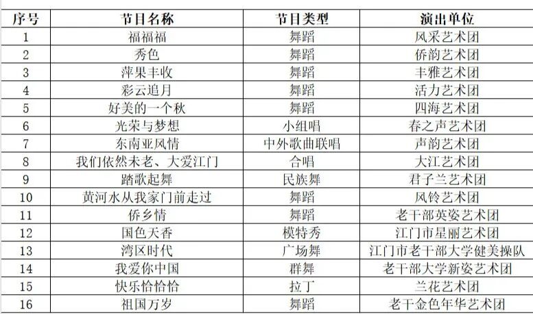 本次考核共有12支A类团队、10支B类团队、4支新增团队参加。考核过程中,各艺术团纷纷亮出拿手好戏,以民族舞、现代舞、广场舞、模特秀、合唱、小组唱、歌舞表演等形式,精彩呈现了《我爱你中国》《湾区时代》《在希望的田野上》《彩云追月》《大爱江门》《侨乡情》等富有地域特色和时代精神的26个文艺节目,充分展现了侨乡广大文艺爱好者阳光向上、积极进取、踔厉奋发的良好精神面貌。
