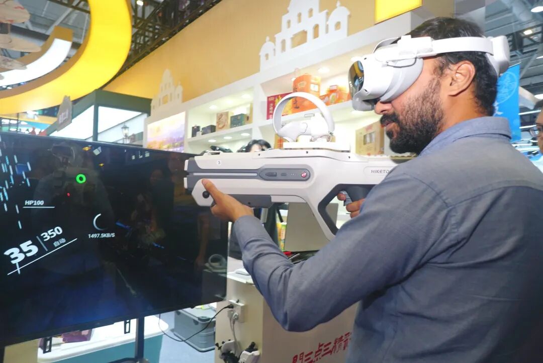 江门市光影文化传媒有限公司带来自己研发的一套VR/AR枪战电竞系统,彰显了江门在科技创新和文化产业融合方面的积极探索与发展活力。公司负责人梁景锋表示,接下来计划围绕江门的特色历史文化,通过AR赋能文旅,打造专属江门特色的游戏场景和体验。