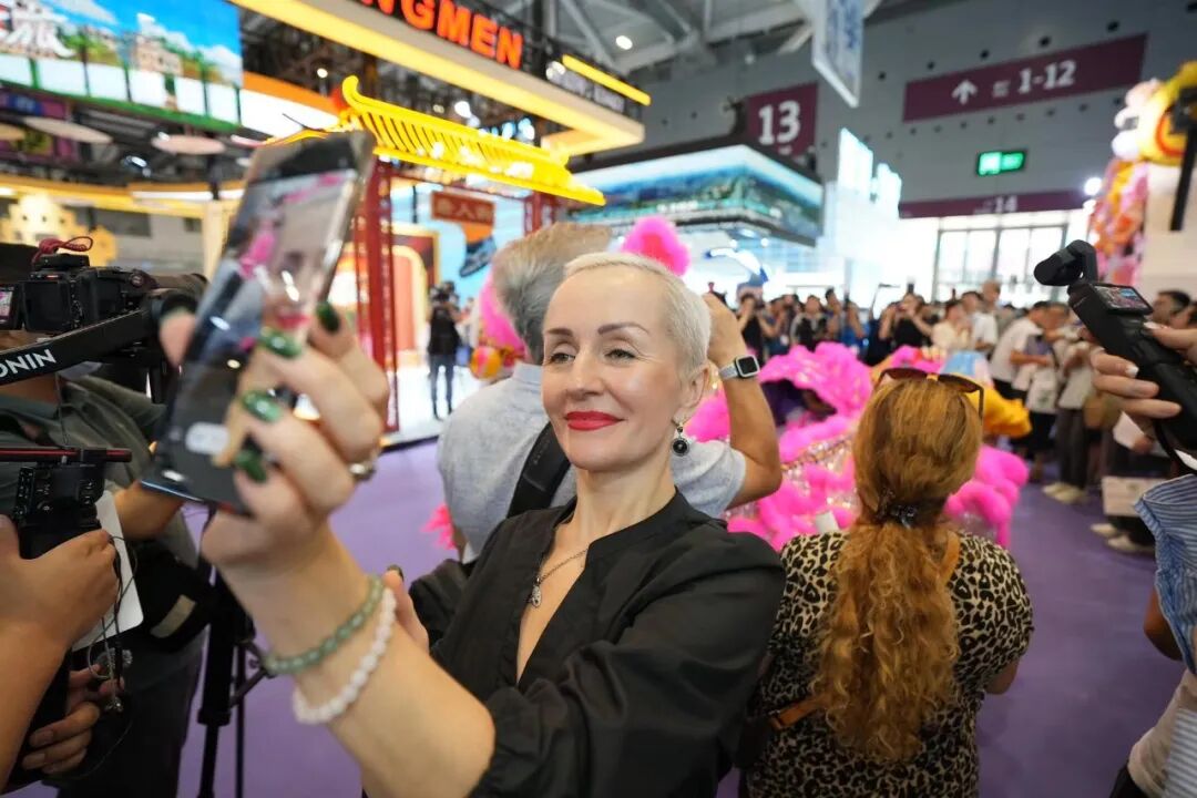 开幕日当天,江门展位的演出节目精彩纷呈,为展会增添了浓厚的文化氛围。气势磅礴的蔡李佛醒狮表演,赢得了现场观众的阵阵掌声,受到众多外籍客商的喜爱。来自哥伦比亚的Raul一边观看蔡李佛醒狮表演,一边用手机拍照录像。Raul表示,醒狮表演很精彩,他喜欢江门。来自俄罗斯的Victoria同样对蔡李佛醒狮很感兴趣,只见她将手机摄像头对准跃动的醒狮,记录醒狮的灵动身姿。Victoria表示,她知道醒狮是中国的传统文化,看到这么精彩有趣的表演,她觉得很激动。