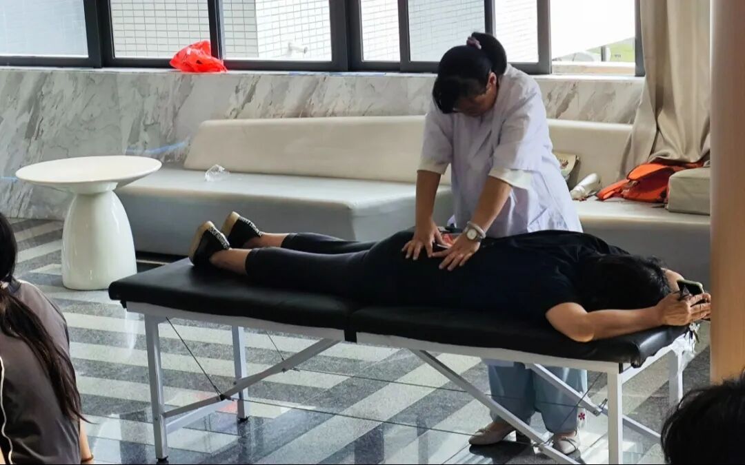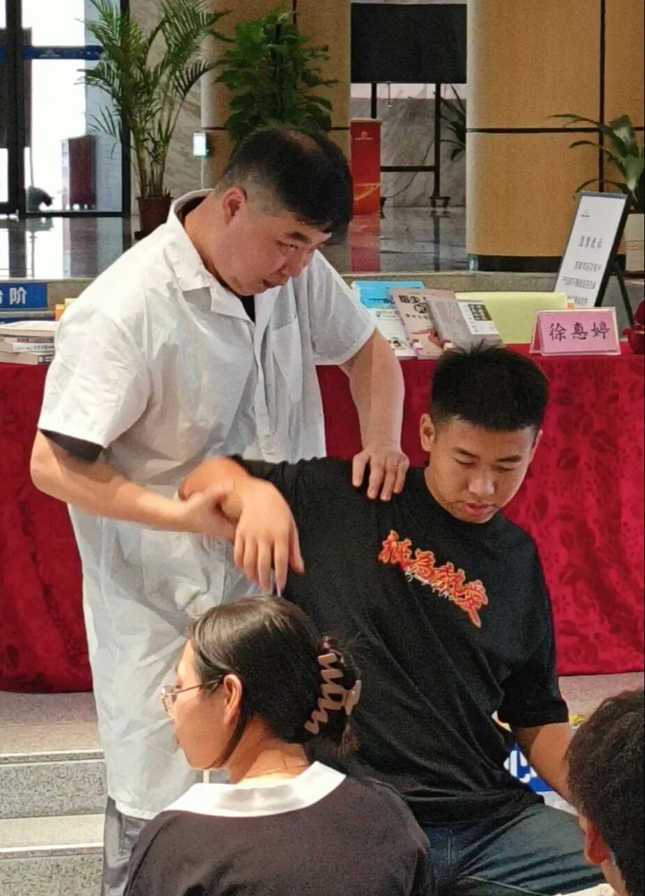活动现场惊喜升级!图书馆特别推出“福葫妙手健康签”端午彩蛋,读者抽取绘有宝葫芦纹样的中医健康体验卡,不仅可以解锁眼部保养秘诀,还可以体验颈椎、腰椎、背部等身体十大部位的中医按摩理疗。周志光老师现场“把脉开方”,从穴位定位到手法教学,边操作边讲解“办公室护眼操”“颈椎急救术”等实用妙招,读者边体验边感叹:“原来平时颈椎不舒服要这样做!还能学会回去给家里人按摩!”活动将端午习俗与中医智慧深度融合,让传统文化真正“活”进生活。