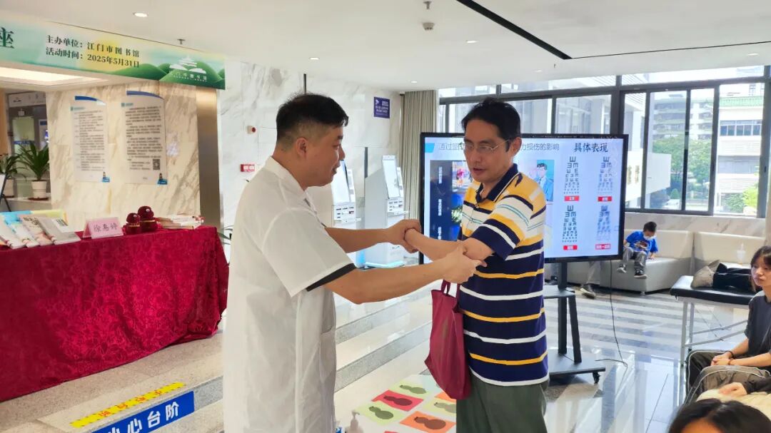 粽香沁书香,爱眼护健康。恰逢第30个“全国爱眼日”来临,5月31日,江门市图书馆以端午佳节为契机,特邀蓬江区盲人协会的周志光主席、徐惠婷副主席两位老师,在南楼阅读连廊开展了“明眸端阳 健康阅读”中医讲座活动。这场别开生面的活动,既是对端午传统的致敬,更是对“关注普遍的眼健康”爱眼日主题的生动实践。