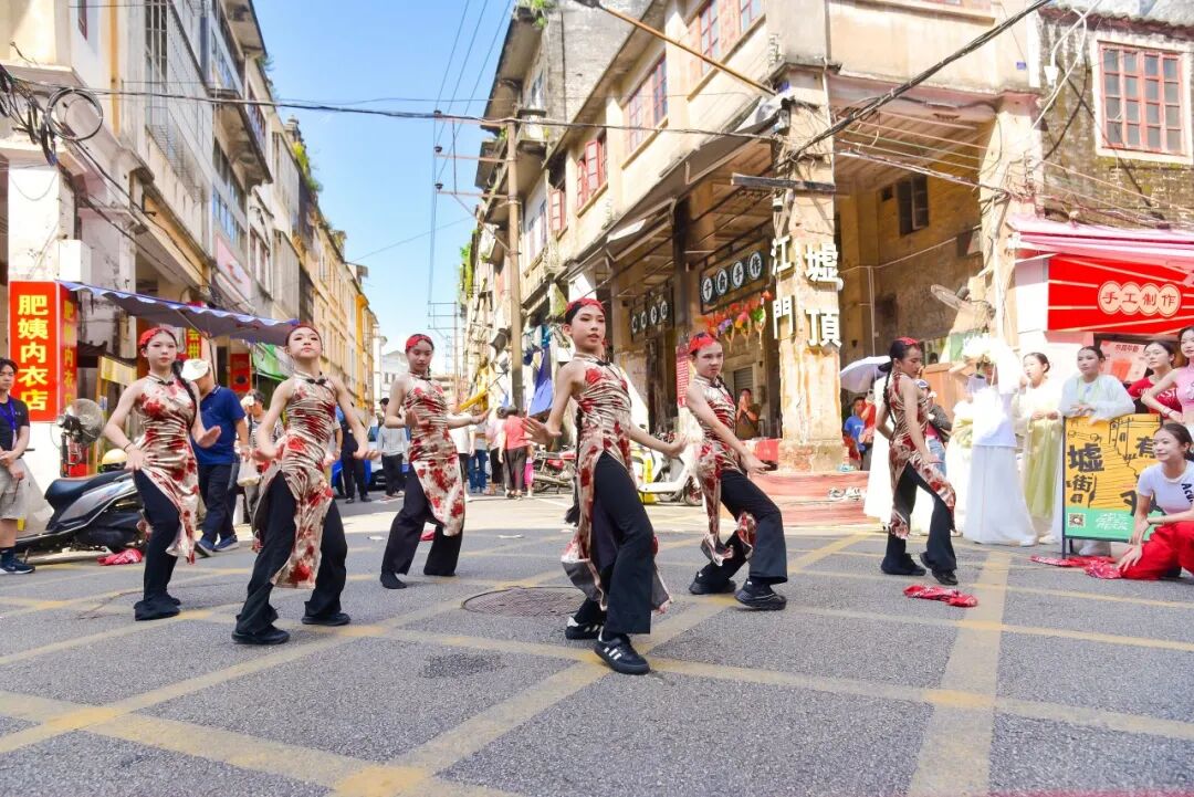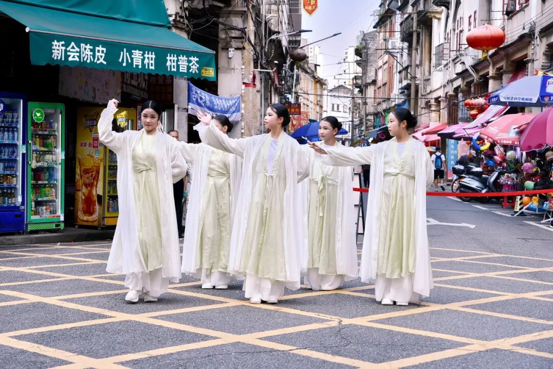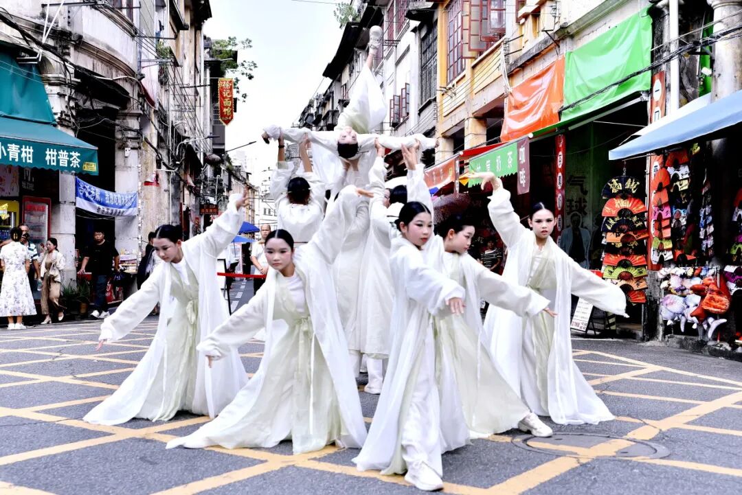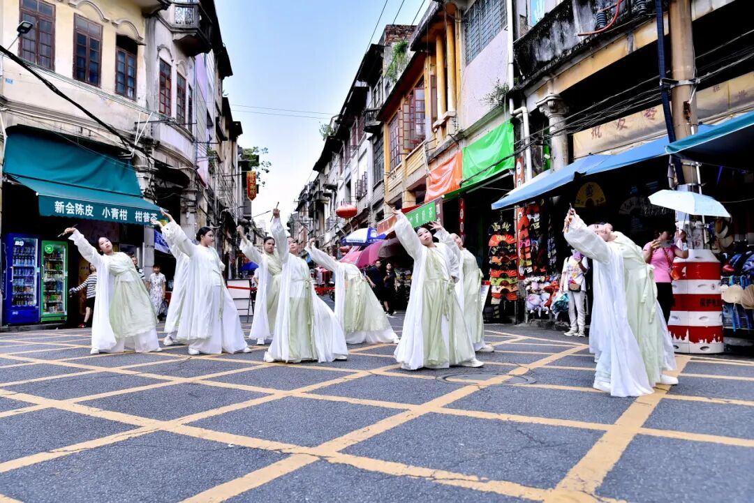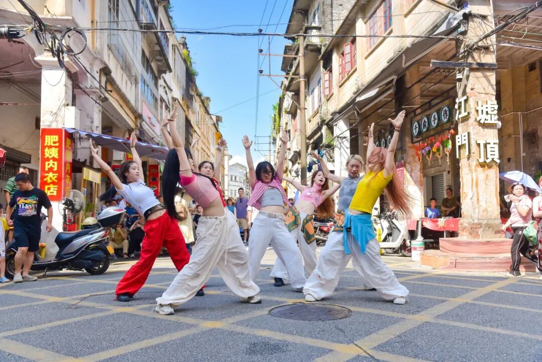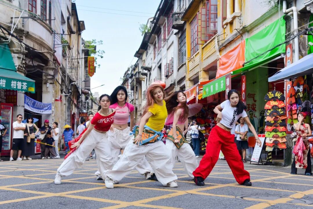 7月26日下午,在长堤历史文化街区的大、小“黄格子”路段,由江门市文化馆精心策划的“墟街有戏”街舞专场如约上演,为骑楼老街注入了青春的时代韵律。