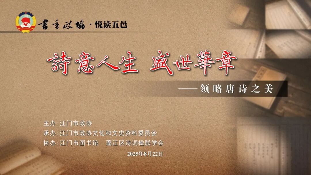 8月22日下午,“书香政协·悦读五邑”系列活动之“诗意人生 盛世华章——领略唐诗之美”读书活动在市图书馆顺利举办。活动由江门市政协主办,江门市政协文化和文史资料委员会承办,江门市图书馆、蓬江区诗词楹联学会协办。市政协机关干部、市政协各委员会委员、各民主党派、市图书馆、蓬江区诗词楹联学会代表,以及市民读者等约180人齐聚一堂,共赴这场诗意盎然的盛会。