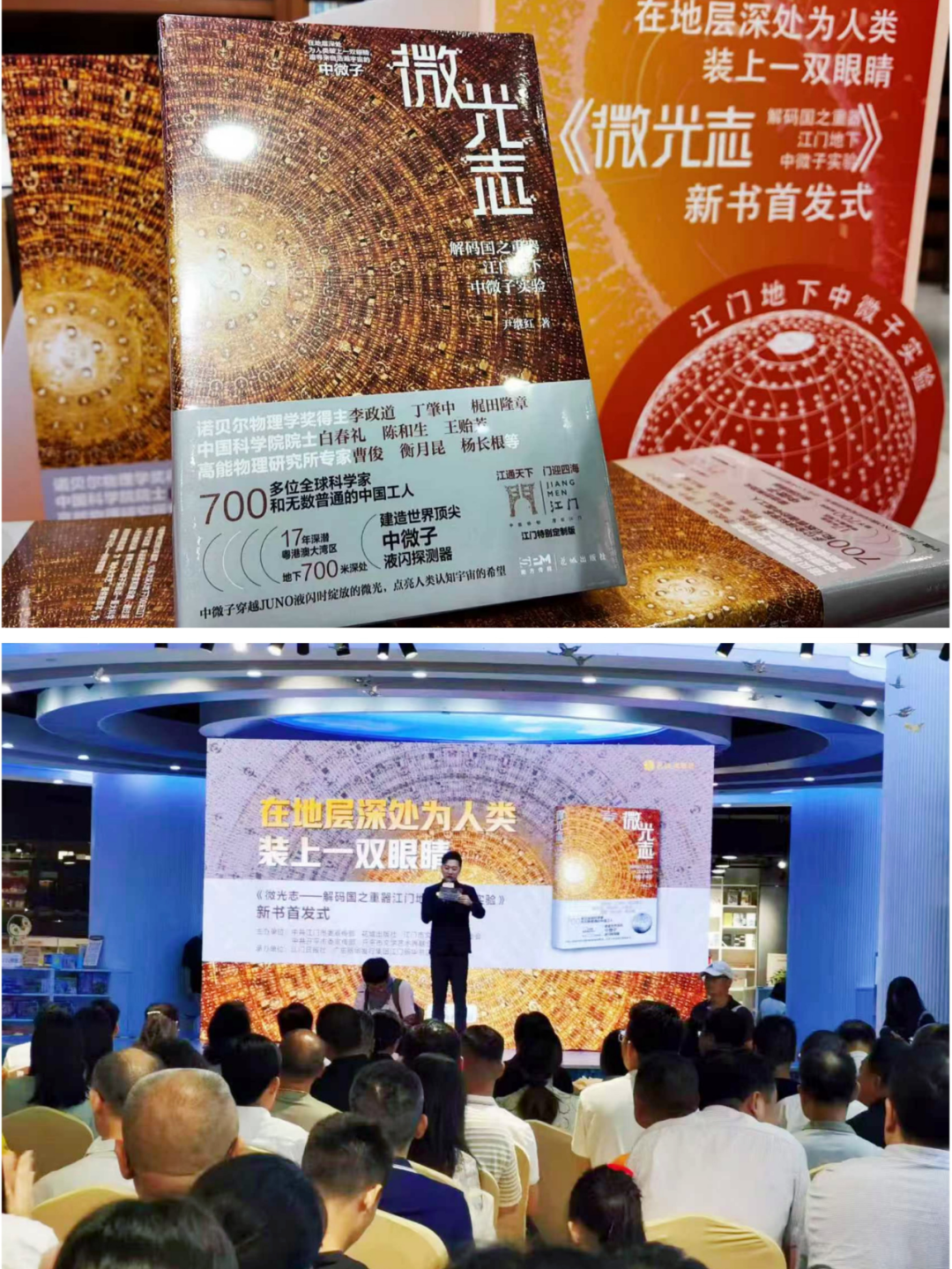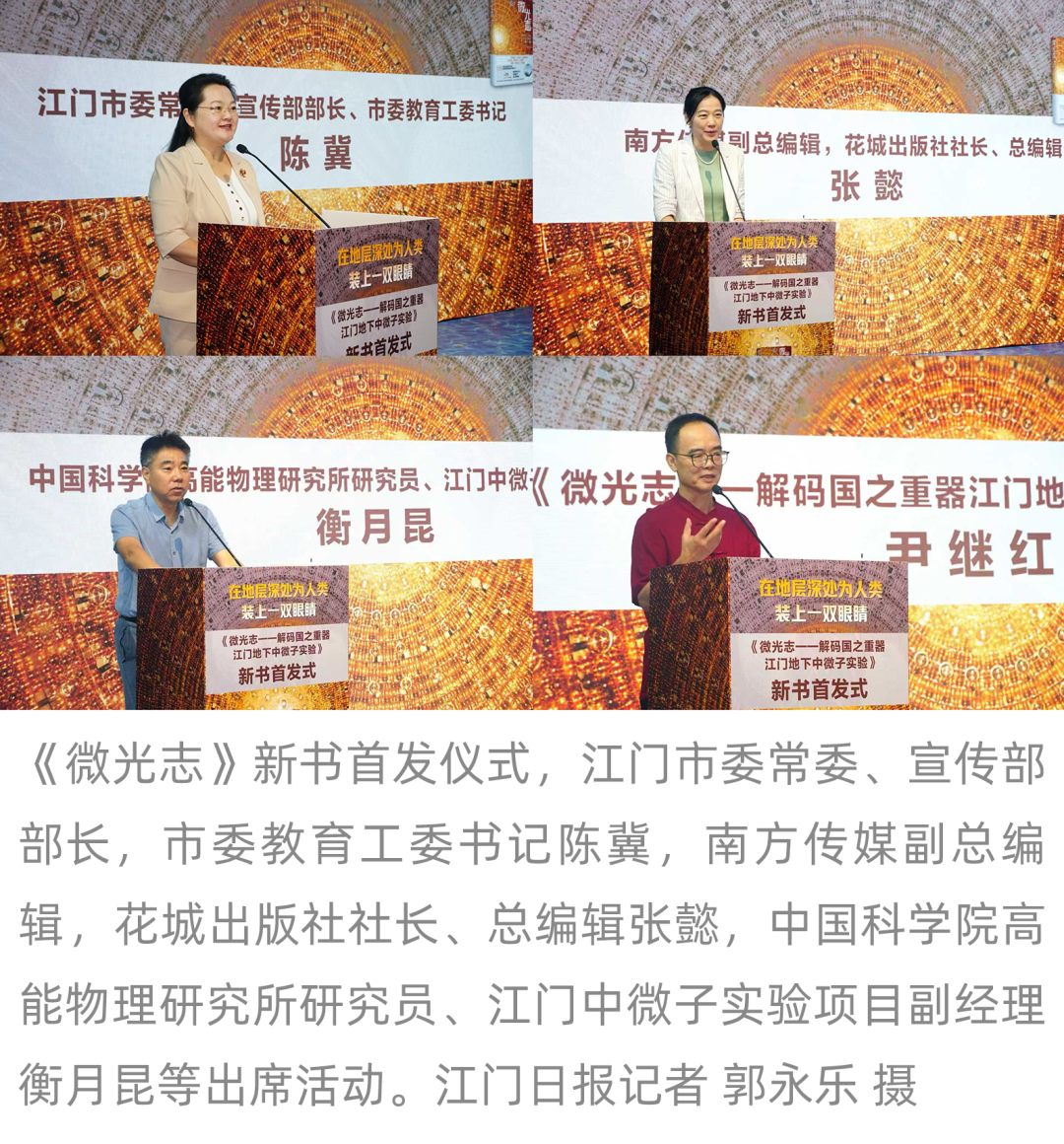 8月31日下午,长篇报告文学《微光志——解码国之重器江门地下中微子实验》(以下简称《微光志》)新书首发式在江门购书中心举行,“科学照耀心灵——百校同读《微光志》科普公益活动”同步启动。江门市委常委、宣传部部长,市委教育工委书记陈冀,南方传媒副总编辑,花城出版社社长、总编辑张懿,中国科学院高能物理研究所研究员、江门中微子实验项目副经理衡月昆等出席活动。