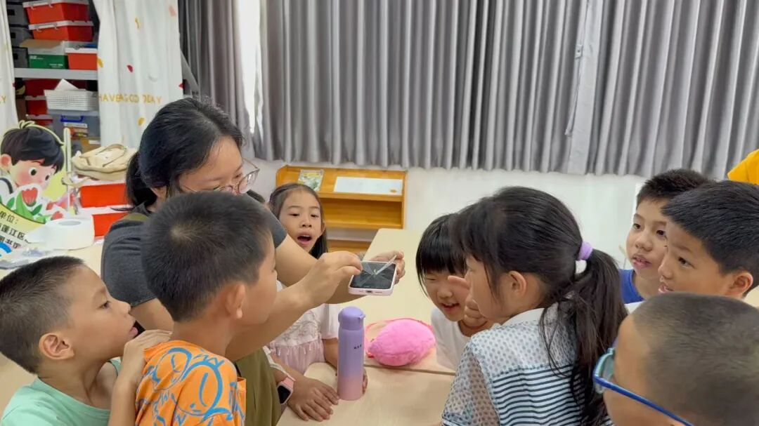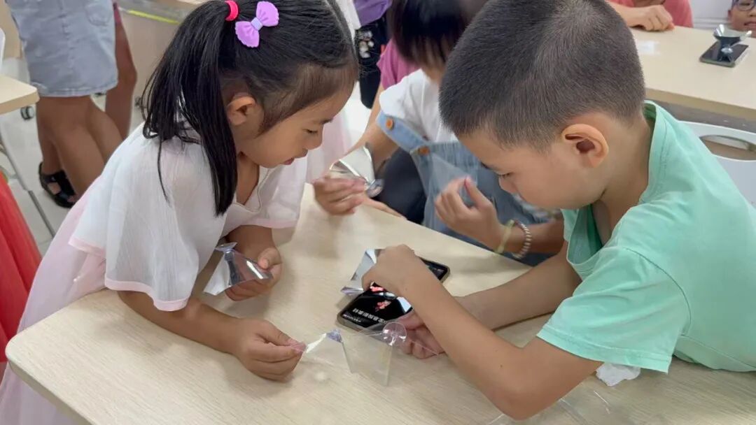 第91期活动带孩子们走进“光影魔法”的世界。志愿者老师先从“什么是光源”入手,让孩子们了解光的直线传播、反射等传播方式;接着发放材料包,指导孩子们折叠、粘贴全息投影支架,将透明胶片固定在正确位置。当打开手机视频、将投影支架对准屏幕时,孩子们惊喜地看到“立体影像”从支架中“跳”出——大家纷纷凑近观察,在动手与观察中,轻松掌握全息投影的基本原理。
