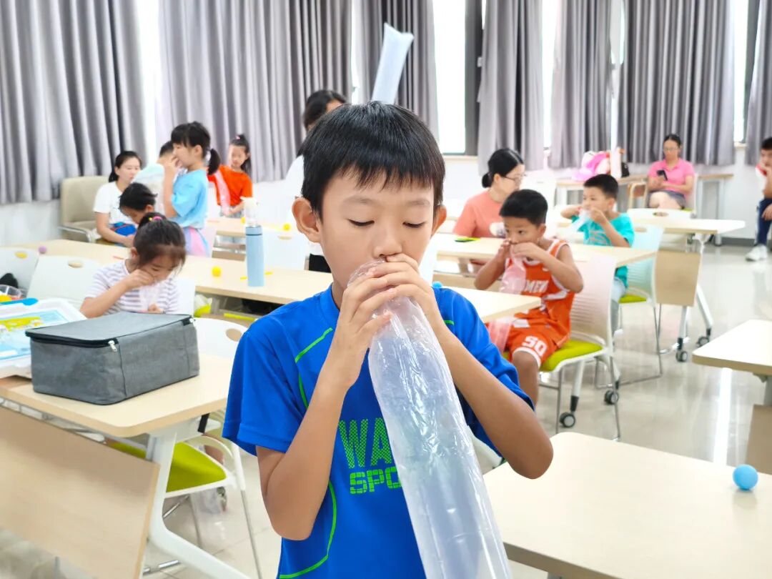 “乒乓球为什么能悬在气流上方不掉落?”第90期活动从一个神奇的实验开始。孩子们在志愿者老师的指导下用吸管吹气托起乒乓球,并好奇地追问气球不掉落的原因——这正是“伯努利效应”的体现。为了巩固理解,大家动手制作空气火箭,当我们在塑料袋中间吹气时,气体会由于压力靠近起来,周围的空气也会被吸到中间流速大的区域,从而进入袋中,于是就会有更多的空气吹鼓了塑料袋,孩子们通过制作空气火箭进一步学习“伯努利效应”。大家在趣味互动中,将抽象的“伯努利原理”转化为看得见、玩得到的科学乐趣。