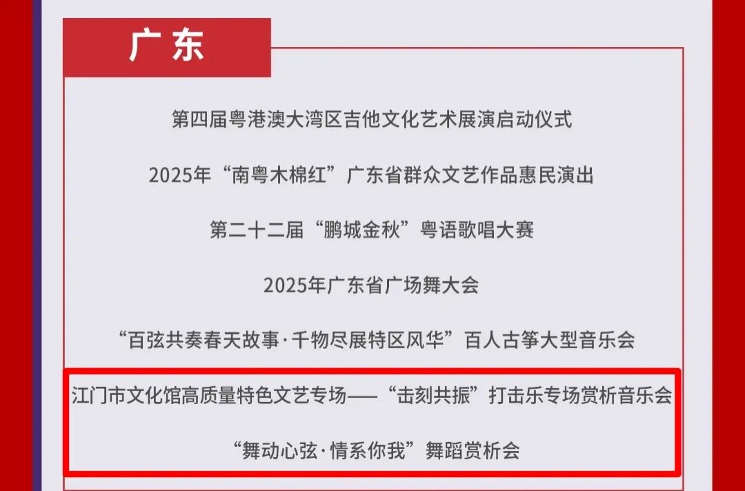 近日,2025年第四季度国家公共文化云网络直录播入选名单公布,江门市文化馆2项活动——江门市文化馆高质量特色文艺专场“击刻共振”青少年打击乐专场赏析音乐会、“舞动心弦·情系你我”舞蹈赏析会成功入选!