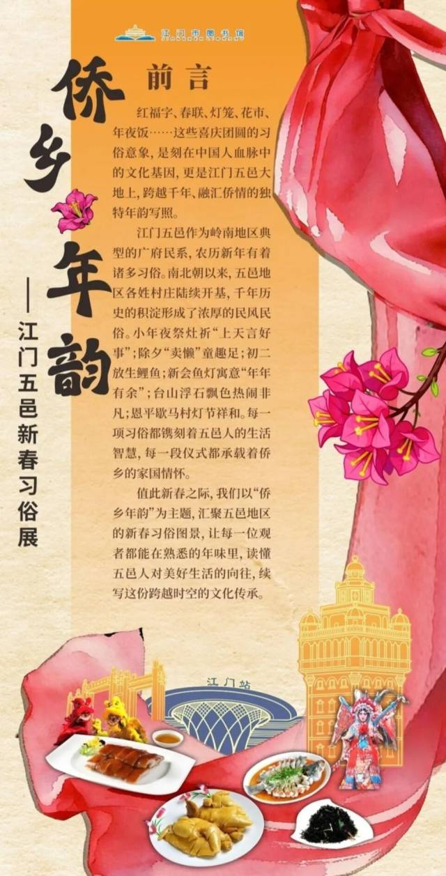 年味渐浓,烟火升腾。这个新春,江门市图书馆门楼二楼休闲阅读连廊将同步推出两大文化展览——「侨乡年韵」江门五邑新春习俗展与「粤味乾坤」广东风味与新春食俗展,带您沉浸式体验岭南年俗的温情与粤菜美食的匠心!