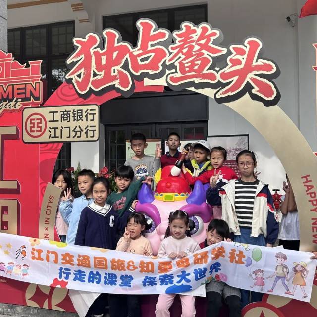 此外,在长堤分馆,博物馆巧妙结合社会热点,在馆门口特别打造了全运会同款大型鳌鱼艺术装置。该装置龙头鱼身、紫气东来,在百年骑楼的映衬下,传统与潮流碰撞出极具冲击力的视觉效果,迅速成为春节期间江门最热门的打卡点之一。大年初三,伴随龙狮巡游活动的热闹步伐,参加过博物馆冬令营培训的红领巾讲解员“集结”博物馆,与博物馆共同开展写福字活动,还为观众提供展览讲解服务,为市民游客送上了别具意义的新春祝福。